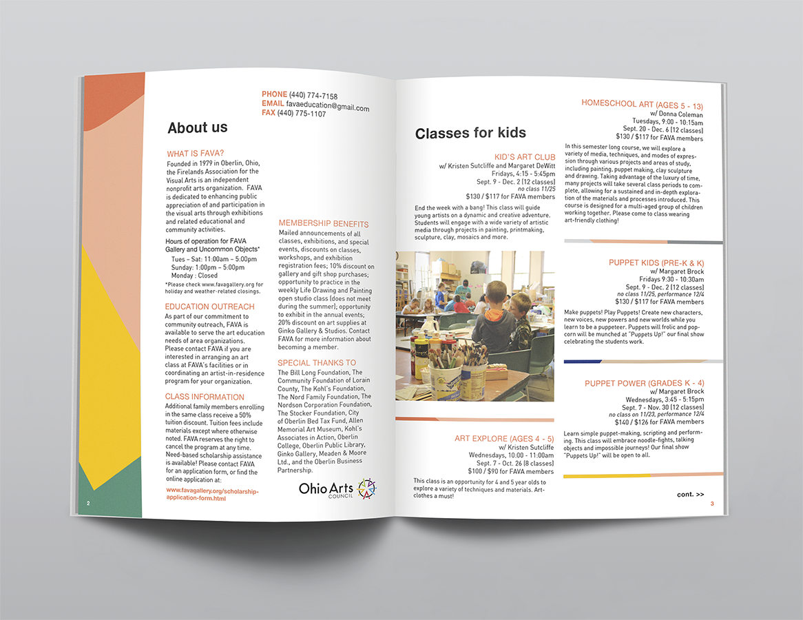 I was responsible for all design and visual assets of FAVA, including designing the course catalog and all other print collateral, managing the website, and creating promotional materials for events. I had almost complete creative control over all design assets, which gave me a platform to explore the balance between functional and creative design.