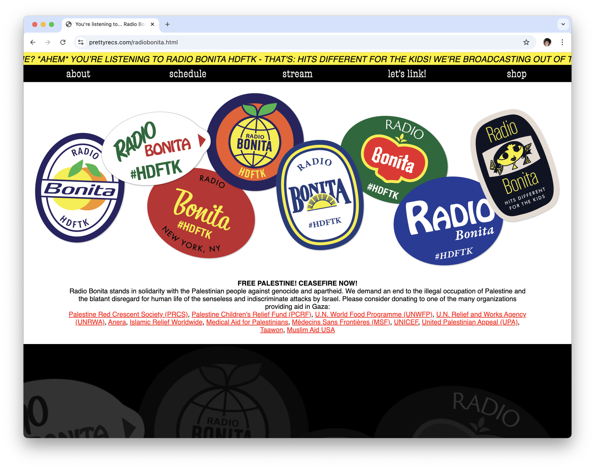 I founded Radio Bonita as a part of my participation in Performance Space New York’s Artist Residency in 2020 with my collective Brujas. I created the name and branding based on a coming together of two groups–Brujas and Pretty Records. I carry this brand identity through the fliers which feature the classic Radio Bonita fruit stickers as overlays and sticker merch. I also designed and coded the website from scratch, and learned all relating to internet radio and streaming which became very necessary when the COVID pandemic hit in 2020. This project highlights my creative and holistic approach to graphic design, as well as my ability to adapt and learn new skills as new solutions are required.